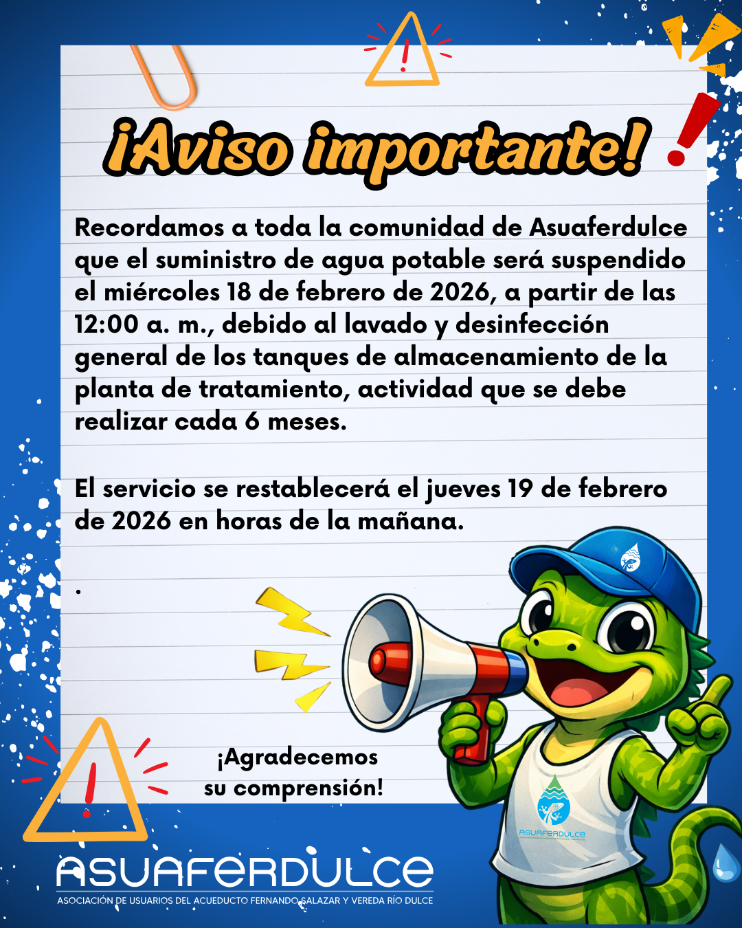 🔉💦Informamos a la comunidad que el servicio de agua potable será suspendido temporalmente el miércoles 18 de febrero de 2026 por lavado y desinfección general de los tanques de almacenamiento, dando cumplimiento a la normatividad vigente. 🔉💦